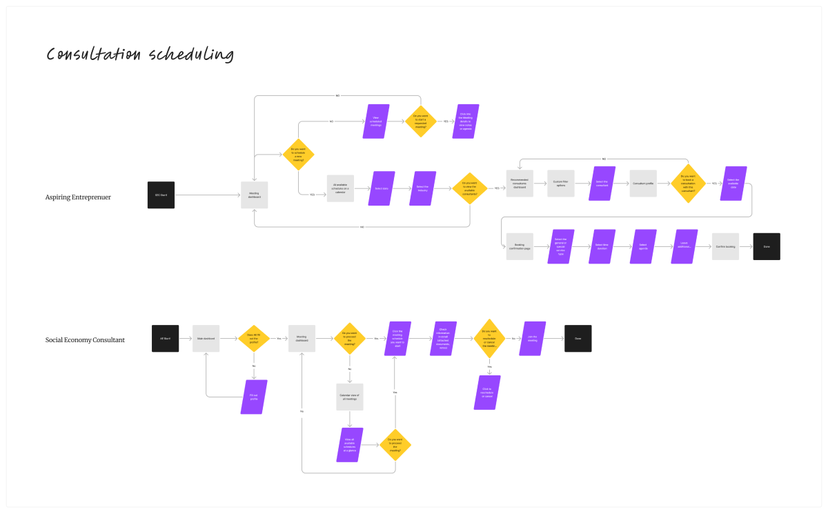 To build out the skeleton of the mobile app, our team then proceeded to create user flows that map out how a user will navigate and be directed in the app to complete their goals.